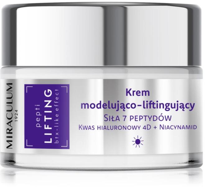 Miraculum Pepti Lifting deep-firming cream day, 50 ml, Arcápoló krémek nőknek, A minőségi Miraculum Pepti Lifting deep-firming cream day készítmény a legjobb ápolást nyújtja az arcbőrének. Tulajdonságok: visszaadja az arcbőr szilárdságát és megőrzi feszességét mérsékli a ráncokat és megelőzi azok kialakulását mélyrehatóan táplálja a bőrt gyorsan felszívódik visszaadja a bőr fiatalos megjelenését Használata: Lehetőleg a szérum felvitele után alkalmazza.