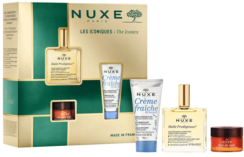 A szett tartalma: Multifunkciós száraz olaj Huile Prodigieuse (Multi-Purpose Dry Oil) 50 ml Hidratáló krém, sminklemosó tej és dúsító maszk 3 az 1-ben Creme Fraiche De Beauté (Moisturising Cream, Make-up Remover Milk and Plumping Mask) 30 ml Tápláló ajakbalzsam Reve de Miel (Ultra-Nourishing Lip Balm) 15 g